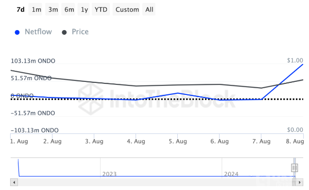 翁多(ONDO)同樣引起了鯨魚(yú)的關(guān)注。根據(jù)IntoTheBlock的數(shù)據(jù),在過(guò)去一周,大型投資者的凈流量增加超過(guò)3000%。正的凈流量意味著鯨魚(yú)們的買入量顯著高于賣出量。
