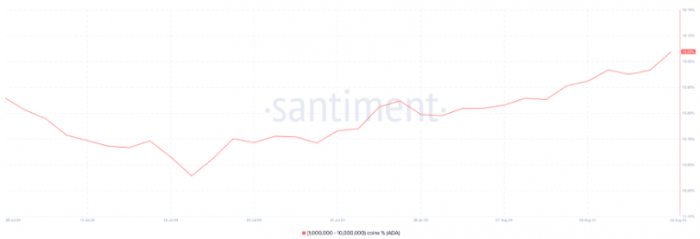 根據(jù)Santiment的數(shù)據(jù),持有100萬(wàn)至1000萬(wàn)ADA的地址數(shù)量有所增加,目前這些地址持有超過(guò)16%的ADA總供應(yīng)量。