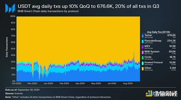 除USDT外,前六大協議中沒有其他協議在交易量上實現環比增長。然而,MEV(環比增長2%至2%)、BNBSystem(環比增長1%至1%)和Circle的USDC(環比增長1%至0.5%)在交易份額上都有所增加。