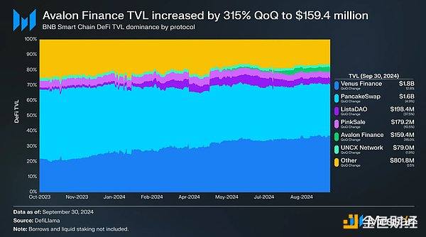 在前六大協議中,除VenusFinance外,唯一TVL有所增長的是AvalonFinance,這是一個在多個網絡上為基于BTC資產提供借貸服務的協議。AvalonFinance于5月在BNBSmartChain上推出借貸市場,并迅速獲得了8位數的TVL。7月31日,AvalonFinance被宣布為BNBIncubationAlliance第二輪的獲勝者之一,這使其快速進入了BNBChain的最有價值建設者(MVB)計劃。在這一宣布之后,AvalonFinance的TVL迅速超過1億美元,并在季度末達到1.594億美元(環比從3,840萬美元增長315%)。