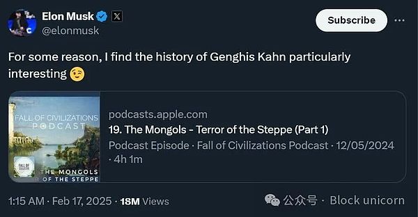 在你忍不住嘲笑馬斯克拼錯“Khan”之前,請記住,成吉思汗本人也無法拼寫自己的名字,因為他從未學過讀寫——這再次生動地提醒我們,書本知識和組織才能是兩件非常不同的事情。那些安慰自己說馬斯克永遠無法征服他們的國家,因為他沒有世界上最高智商的進步主義者,就像13世紀的學者告訴自己,他的國家永遠不會被一個騎著小馬的文盲征服一樣愚蠢。