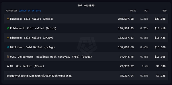 通過(guò)Arkham,我們可以看到哪些具體錢(qián)包持有最多的Bitcoin: