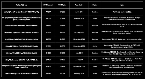 以下是最大的未歸屬Bitcoin持有者表格,顯示其持有的Bitcoin數(shù)量、占流通供應(yīng)量的百分比、錢(qián)包狀態(tài)以及對(duì)錢(qián)包的觀察。