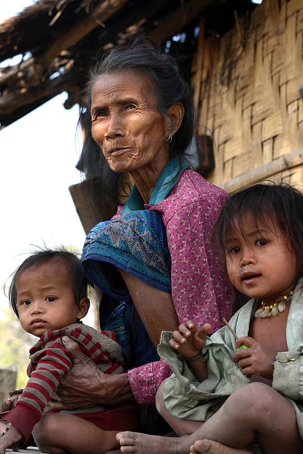 (圖為2005年,老撾一座因水電站建設而被淹沒的村莊內,一位老撾老婦人與她的孫輩。來源:法新社)