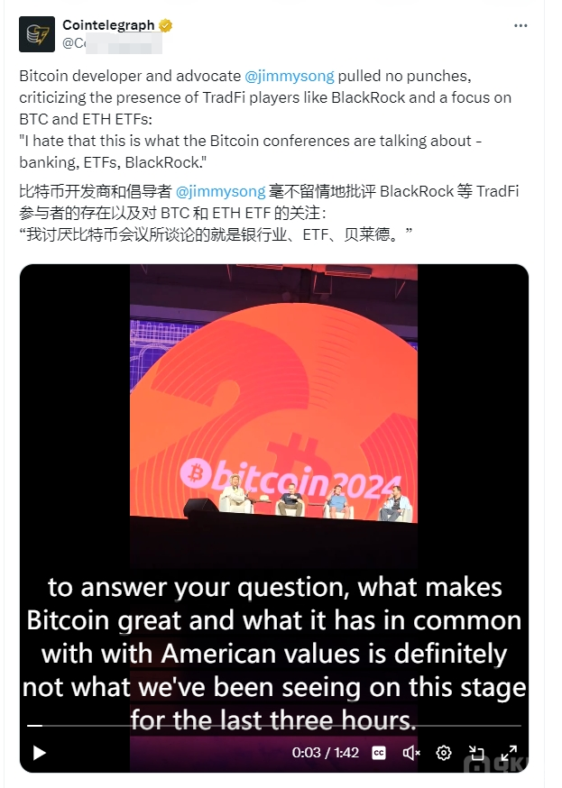 Song 還表示“我討厭這就是Bitcoin會議所討論的內容。銀行、ETF、貝萊德。這些不是我的價值觀,這些不是Bitcoin的價值觀,這些不是美國的價值觀。”